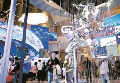 参观者在张江科学会堂的机器人展示装置前驻足观看。 新华社记者 方喆 摄