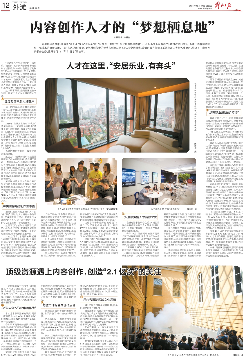 一本崭新的户口本,让博主“萧大业”成为“沪九条”推出后落户上海的“001号优质内容创作者”;一处配备专业设备的“外滩FTC”创作空间,为中小内容团队提供了低成本的追梦阵地;一场“艺术外滩”盛会,更凭借创作者的镜头与创意获得2.1亿次全网曝光。黄浦区着力打造互联网优质内容创作集聚区,构建了一套完整的服务生态,诠释着“引才、育才、留才”的故事。