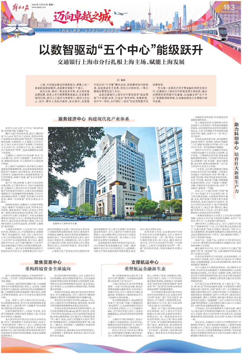 作为唯一总部在沪的中管金融机构所在地分行,交通银行上海市分行积极发挥主场优势,通过全牌照优势和数字化重塑,以金融支持“五个中心”发展取得新突破,让金融血脉有力支撑超大城市发展。