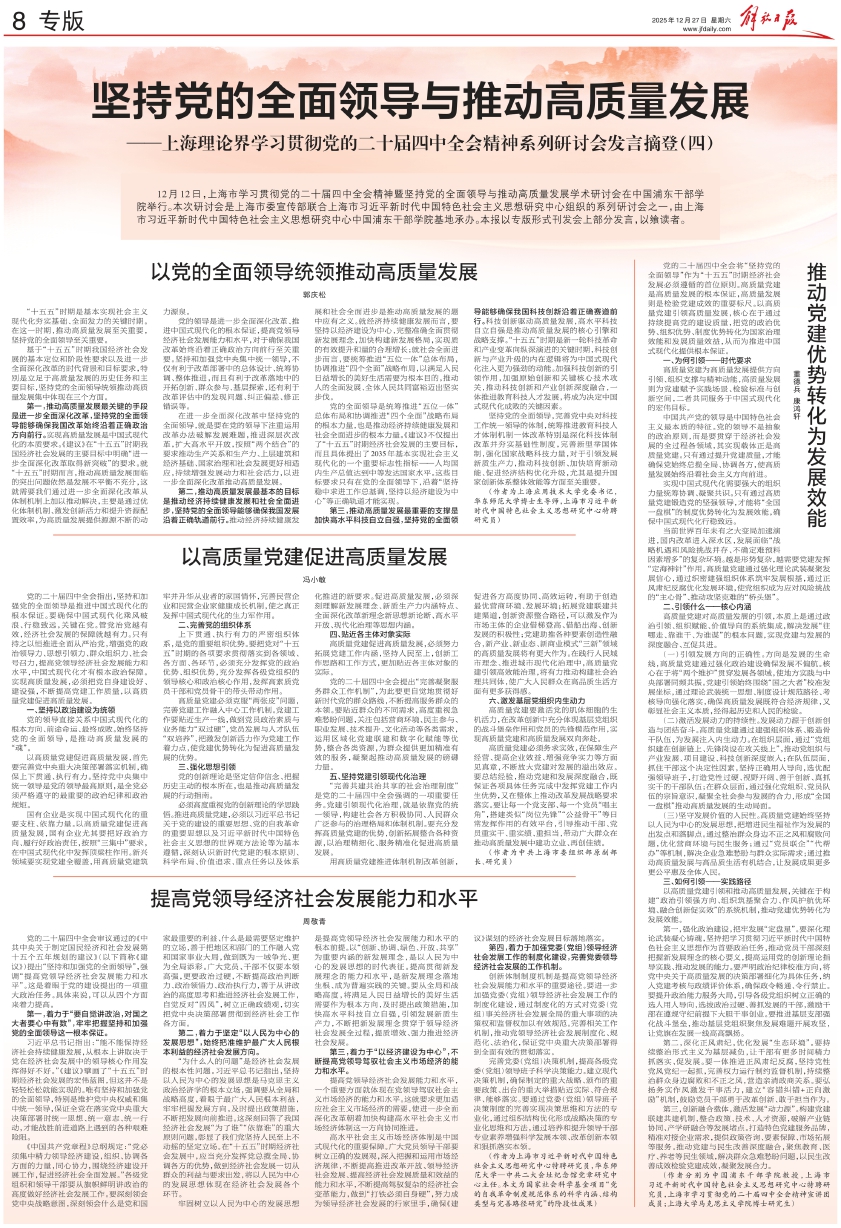 党的二十届四中全会指出,坚持和加强党的全面领导是推进中国式现代化的根本保证。要确保中国式现代化乘风破浪、行稳致远,关键在党。管党治党越有效,经济社会发展的保障就越有力。只有持之以恒推进全面从严治党,增强党的政治领导力、思想引领力、群众组织力、社会号召力,提高党领导经济社会发展能力和水平,中国式现代化才有根本政治保障。实现高质量发展,必须把党自身建设好、建设强,不断提高党建工作质量,以高质量党建促进高质量发展。