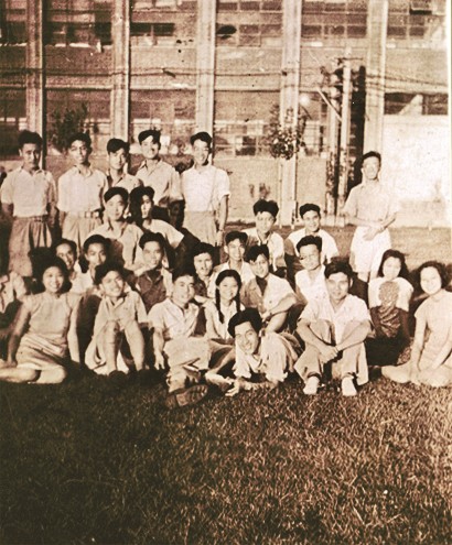 上海解放后,“山茶社”社员在交大校园内合影(前排卧者为黄旭华)。 资料图片