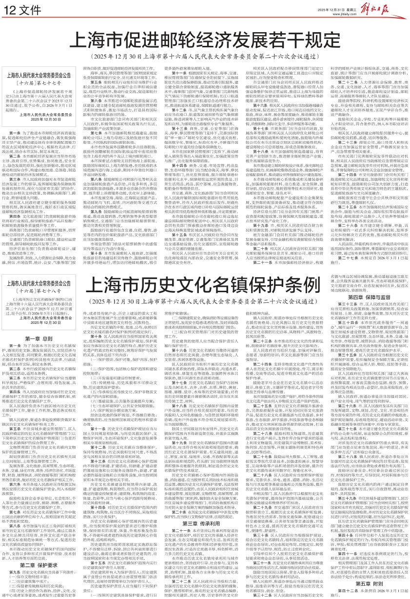 《上海市历史文化名镇保护条例》已由上海市第十六届人民代表大会常务委员会第二十六次会议于2025年12月30日通过,现予公布,自2026年3月1日起施行。