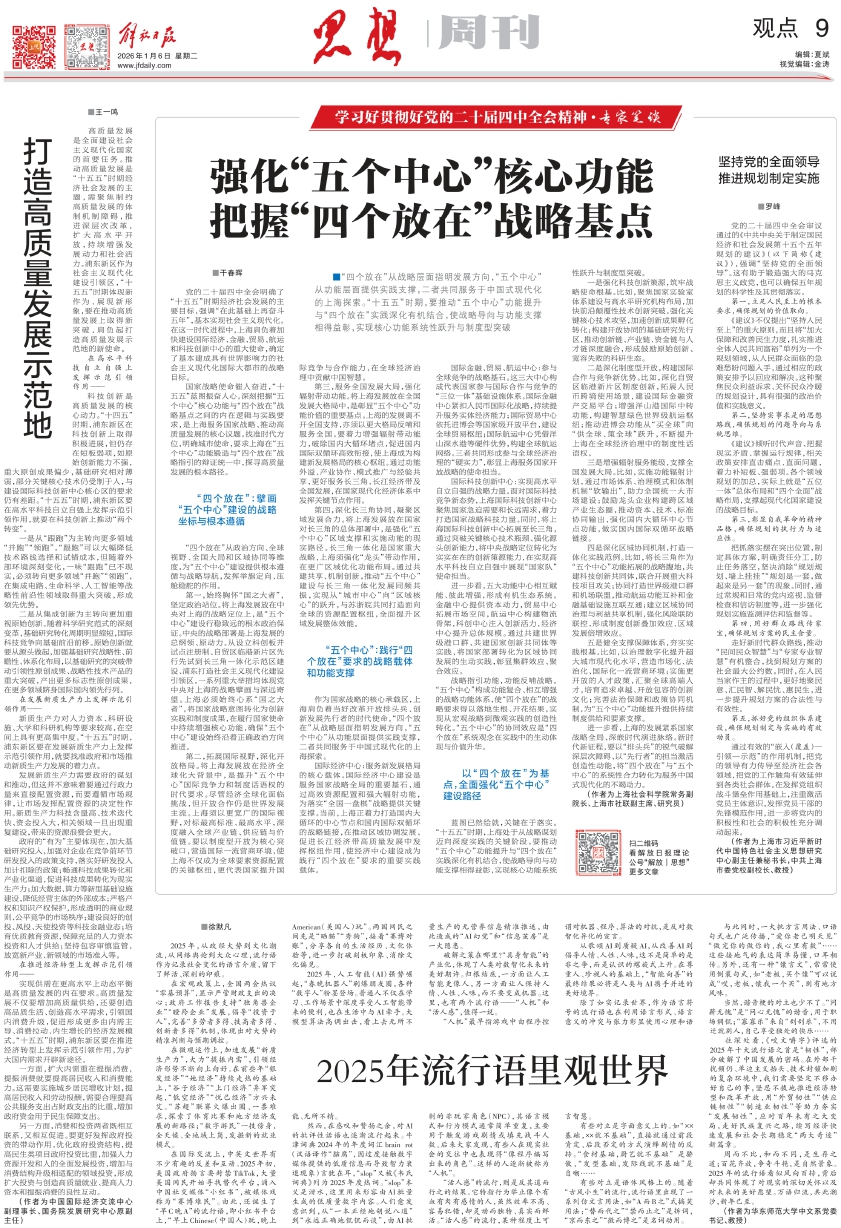 国家战略使命催人奋进,“十五五”蓝图振奋人心。深刻把握“五个中心”核心功能与“四个放在”战略基点之间的内在逻辑与实践要求,是上海服务国家战略、推动高质量发展的核心议题。找准时代方位,明确城市使命,要求上海在“五个中心”功能锻造与“四个放在”战略指引的辩证统一中,探寻高质量发展的根本路径。