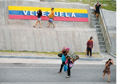 1月6日,在巴西罗赖马州帕卡赖马,人们行走在写有委内瑞拉国名的标志前。帕卡赖马是委内瑞拉移民陆路进入巴西的主要通道,巴西军方近日在此处加强了对过境的巴西和委内瑞拉人员的检查。 新华社发