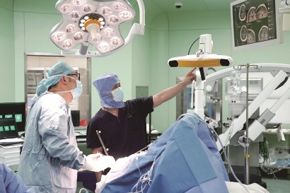 2025年3月25日,在复旦大学附属华山医院手术室,路俊锋教授(左)和吴劲松教授在进行我国第一例侵入式脑机接口临床试验手术。 新华社 发 -