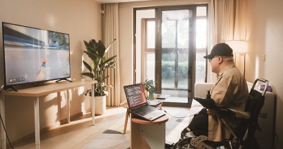 2025年4月30日,在位于上海的受试者住所,受试者通过脑机接口玩赛车游戏。 新华社 发