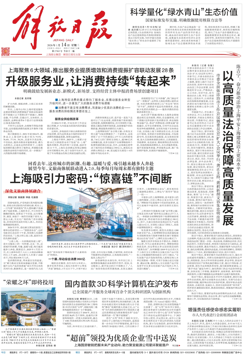 此次《若干措施》聚焦6大服务业领域提出相关支持政策。例如,在金融领域,《若干措施》支持创新开发消费信贷、商业保险等金融产品,推动“消费场景+消费金融”深度融合。在平台消费领域,引导平台企业良性竞争和减佣降费,支持其向线下实体商业引流,实现线上线下消费良性互动。在交通出行领域,支持新开加密国际航线、开发旅游专列、优化枢纽商业配套。在文体娱乐领域,放大文旅商体展联动效应,以高端展览、顶级赛事、电竞游戏、微短剧等优质内容供给,创造现象级消费热点。在生活服务领域,提升家政服务质量、养老服务品质,推广免陪照护服务,拓展医疗健康服务。下转 5版(上接第1版)在品牌标准领域,提升检验检测服务能力,支持建设高能级检验检测平台等。