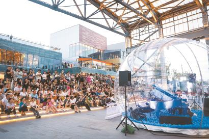 2025年夏季,在徐汇滨江西岸梦中心的船坞码头,一个名为“海洋泡泡”的装置和每天傍晚的钢琴演奏,吸引众多市民游客前来打卡。 本报记者 海沙尔 摄(资料照片)