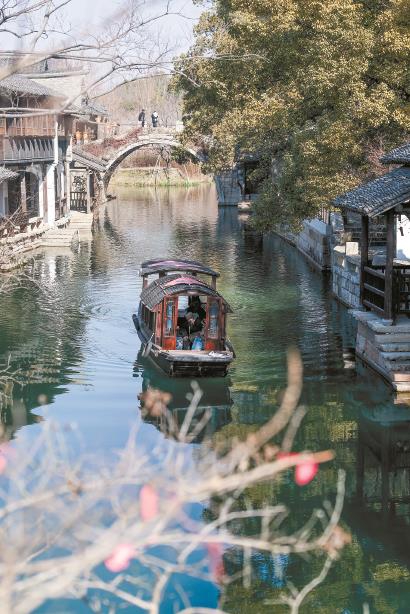 手划船载着游客行驶在嘉兴桐乡市的河道中。 新华社发