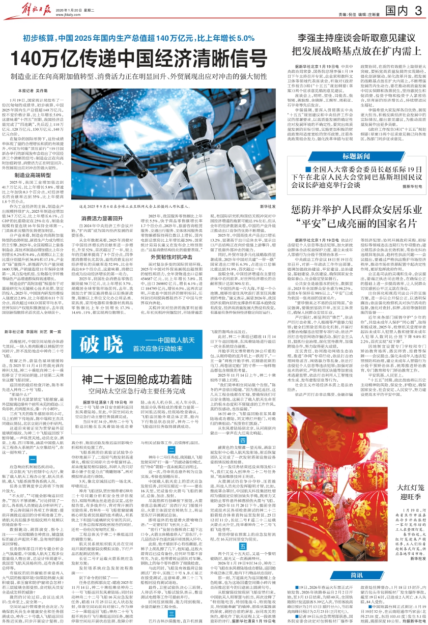 李强强调,要深入贯彻落实中央“十五五”规划建议和中央经济工作会议的部署要求,以高质量发展的确定性应对发展环境的不确定性。要突出高质量发展的目标引领,实施更加积极的财政政策和适度宽松的货币政策,注重各类政策组合发力,强化改革举措与宏观政策协同,在质的有效提升上取得更大突破。要拓宽高质量发展的实现路径,强化创新驱动,深化改革开放,把发展的战略基点放在扩大内需上,不断增强发展的内生动力。要在推动高质量发展中切实保障和改善民生,坚持惠民生和促消费、投资于物和投资于人紧密结合,培育新的经济增长点,持续增进民生福祉。