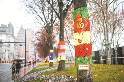 近日,上海外滩街头悄然换上新装——沿线的行道树纷纷“穿”上了手工编织的彩色毛线织物,为历史建筑群林立的街区注入温暖灵动的艺术气息。这些织物以花纹、福字、红灯笼等图案点缀,不仅为树木保暖,更提前营造出温馨的年节氛围,吸引不少市民驻足打卡。