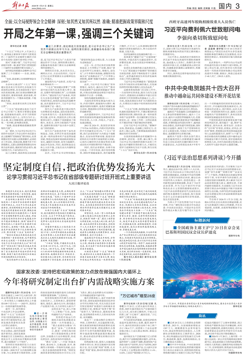 在省部级主要领导干部学习贯彻党的二十届四中全会精神专题研讨班开班式上,习近平总书记发表重要讲话,深刻阐明制定和实施五年规划是我们的重要政治优势,围绕全面深刻准确领会和把握党的二十届四中全会战略部署作出深入阐述,对着力提高党领导经济社会发展能力和水平提出明确要求,强调“要把学习贯彻党的二十届四中全会精神不断引向深入,更好统一思想、凝心聚力,在党中央坚强领导下扎实做好各项工作,努力实现‘十五五’良好开局”。