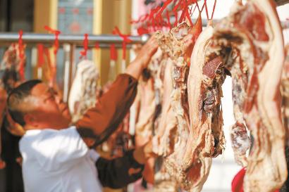 在安徽省黄山市徽州区西溪南镇,村民正在院子里晾晒腊味。 视觉中国