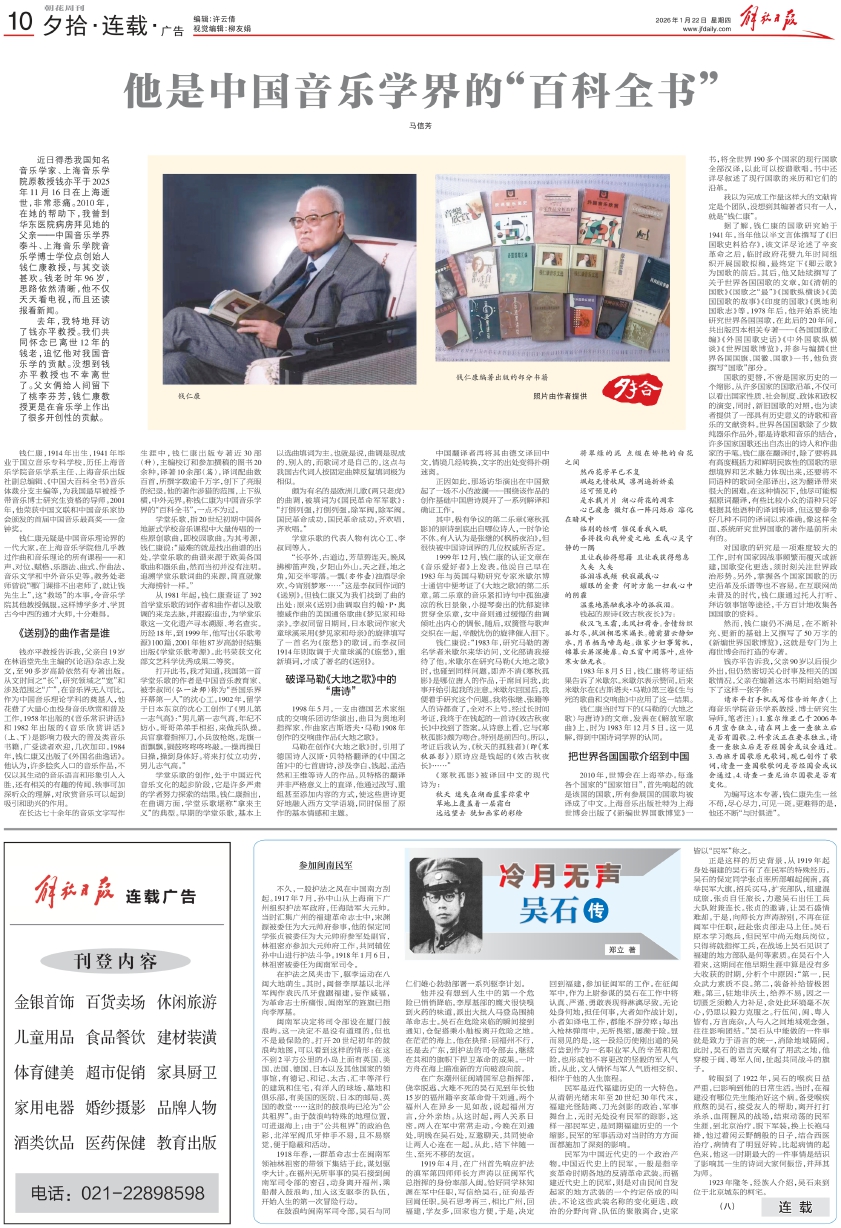 去年,我特地拜访了钱亦平教授。我们共同怀念已离世12年的钱老,追忆他对我国音乐学的贡献。没想到钱亦平教授也不幸离世了。父女俩给人间留下了桃李芬芳,钱仁康教授更是在音乐学上作出了很多开创性的贡献。