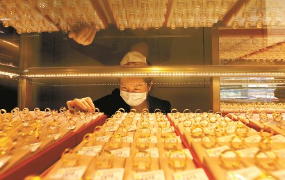 1月26日,纽约商品交易所黄金期货价格和伦敦现货黄金价格盘中双双突破每盎司5100美元。图为一家金店店员在整理黄金饰品。 新华社 发