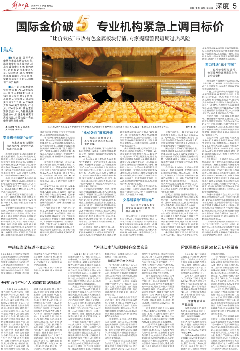 ■这一轮上涨速度之快前所未有。Wind数据显示,金价从4000美元涨至5000美元仅用时3个多月,而此前从3000美元到4000美元用了7个月,从2000美元到3000美元则耗时17个月。2026年以来,黄金累计涨幅已超15%,白银更是暴涨逾50%,引发全球投资者高度关注,并带动整个有色金属板块集体走强