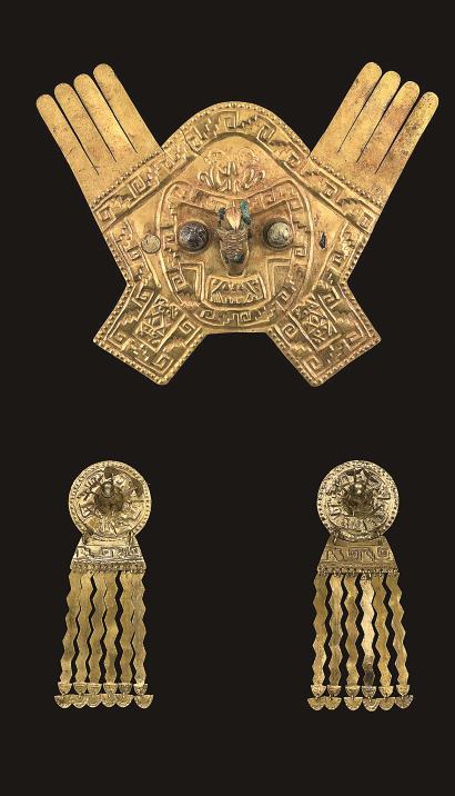 黄金额饰和耳饰奇穆文化(公元1100—1470年),秘鲁拉尔科博物馆藏。 -