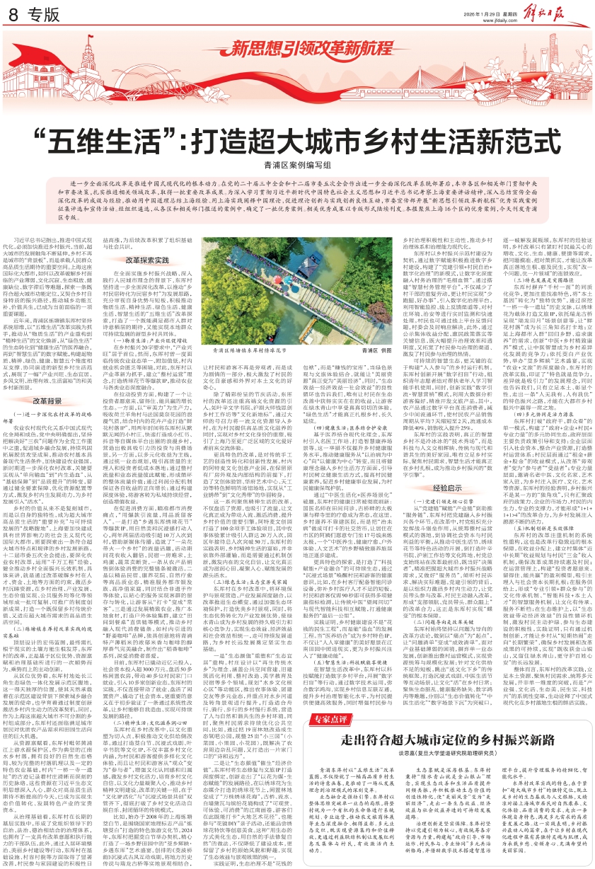 习近平总书记指出,推进中国式现代化,必须加快推进乡村振兴。当前,超大城市的发展触角不断延伸,乡村不再是城市的“背景板”,而是承载人民群众高品质生活期待的重要空间。上海这座国际化大都市,如何以改革破解乡村面临的产业薄弱、文化沉寂、生态粗放、健康缺位、数字滞后等难题,探索一条既符合超大城市功能定位,又契合乡村自身特质的振兴路径,推动城乡功能互补、价值共生,已成为当前面临的一项重要课题。