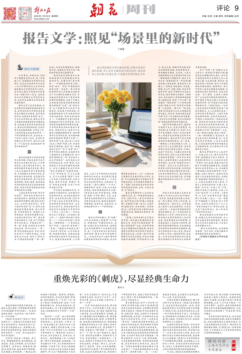 报告文学不是历史著述,而是对现实具有独特发现的真实记录,在时光的长河中演化为存录信息丰赡的文字档案。其中的优秀作品,或将成为未来的“史记”。生活无比开阔辽远,报告文学不只有报告砥砺奋进伟业的国家叙事,还需要具有社会内涵的风景志,展示时代别样的风景,记录另有文化意蕴的物事。文学是人学。人民的创造是最美丽的华章。一个时代的报告文学,应当成为一个时代人民的心灵史。在2025年的报告文学作品中,我们可以看见一个气象生动、跃然奋进的“场景中的新时代”。