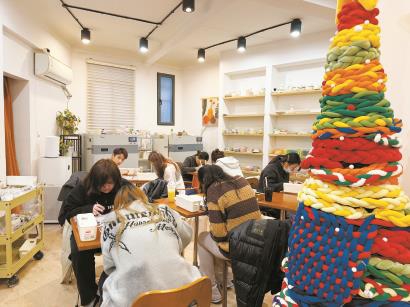 今年20岁的“一一”和“玉米狗”坐在靠近门口的位置。“一一”是山东人,在韩国留学,追星时认识了家在上海的“玉米狗”,趁寒假相约在上海游玩,两人把其中一项行程定在拼豆店。“我拼了两个喜欢的偶像,是根据他们在演唱会上的造型拼的像素小人。”“一一”翻出手机里的照片,将自己的拼豆摆在一旁,人物造型的拼豆用色多且杂,虽然整体不算大,但一件作品也耗费了她40分钟左右,“第一次玩拼豆觉得挺解压,也挺有乐趣,但长时间坐着,还要低头弯腰,累也是真的累。”坐在她对面的“玉米狗”今年高三,也计划未来去韩国留学,她正在专心致志地拼一款歌手周深的周边,打算送给妈妈作为礼物,“10年前我读小学的时候就玩过拼豆,最近又火了起来,突然被大家发现了”。