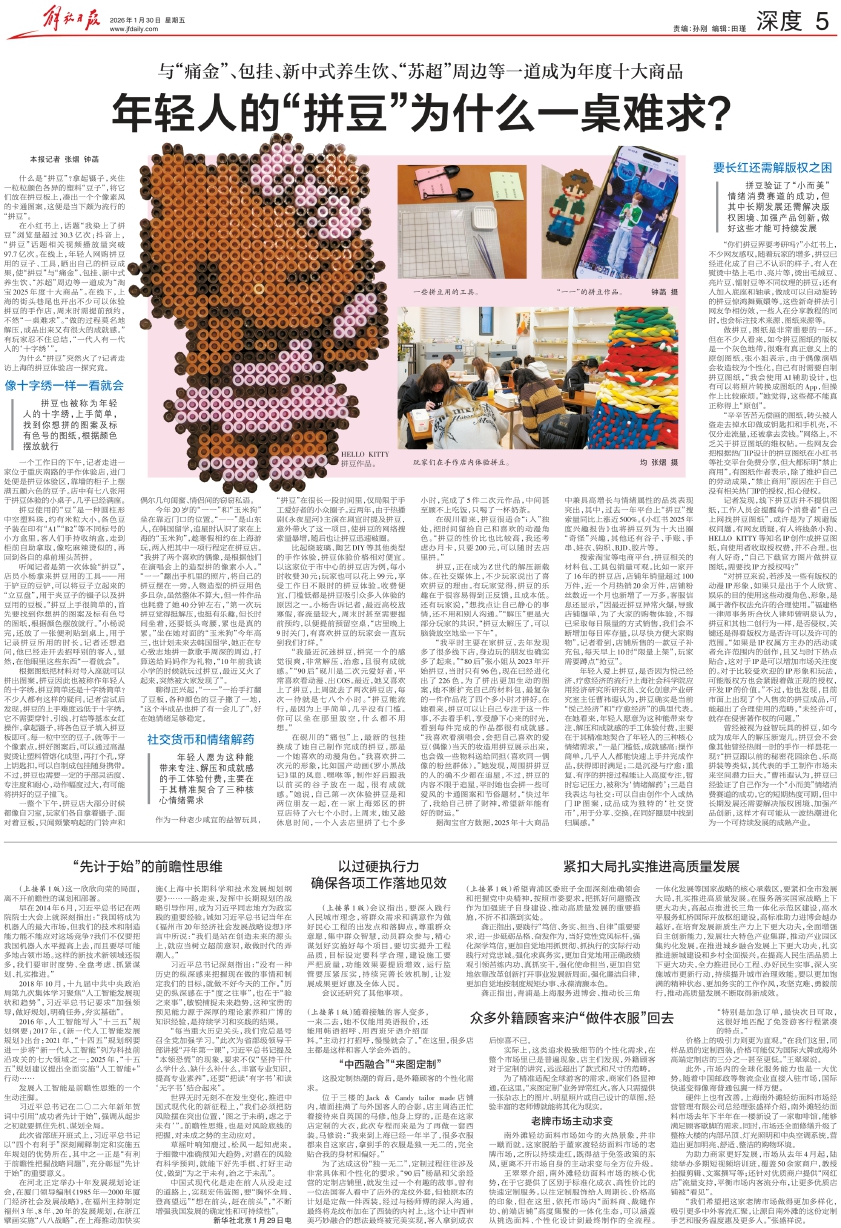 年轻人爱上拼豆,是否因为悦己经济、疗愈经济的流行?上海社会科学院应用经济研究所研究员、文化创意产业研究室主任曹祎遐认为,拼豆确实是当前“悦己经济”和“疗愈经济”的典型代表。在她看来,年轻人愿意为这种能带来专注、解压和成就感的手工体验付费,主要在于其精准地契合了年轻人的三种核心情绪需求,“一是门槛低,成就感高:操作简单,几乎人人都能快速上手并完成作品,获得即时满足;二是沉浸与疗愈:重复、有序的拼接过程能让人高度专注,暂时忘记压力,被称为‘情绪解药’;三是自我表达与社交:可以自由创作个人或热门IP图案,成品成为独特的‘社交货币’,用于分享、交换,在同好圈层中找到归属感。”
