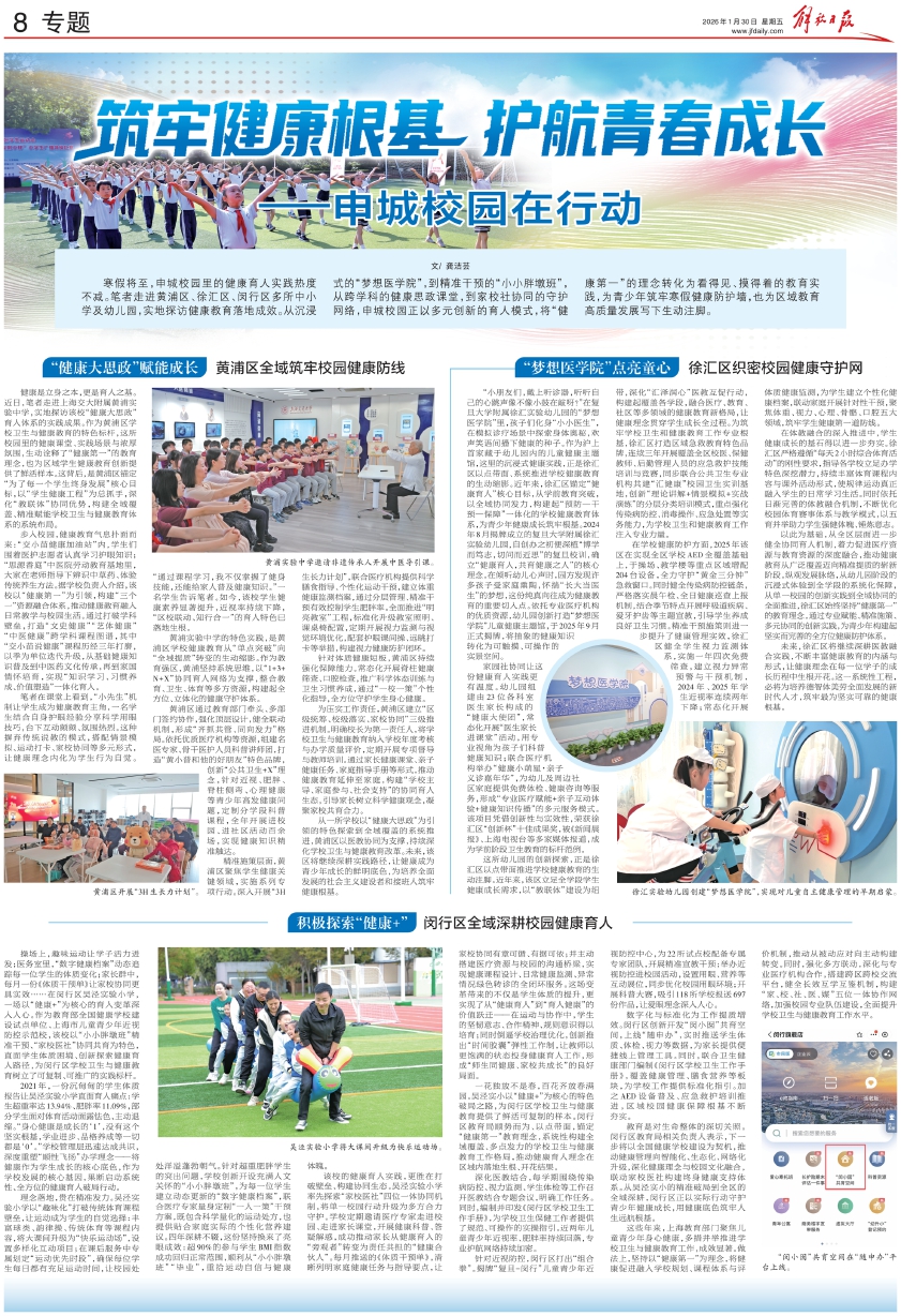 寒假将至,申城校园里的健康育人实践热度不减。笔者走进黄浦区、徐汇区、闵行区多所中小学及幼儿园,实地探访健康教育落地成效。从沉浸式的“梦想医学院”,到精准干预的“小小胖墩班”,从跨学科的健康思政课堂,到家校社协同的守护网络,申城校园正以多元创新的育人模式,将“健康第一”的理念转化为看得见、摸得着的教育实践,为青少年筑牢寒假健康防护墙,也为区域教育高质量发展写下生动注脚。