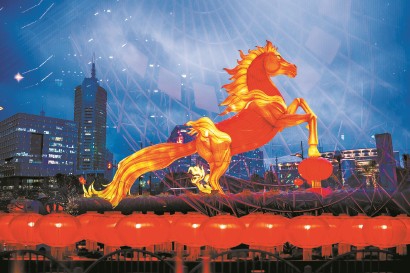 “来浦东 过大年”新春系列活动启动。图为在世纪大道布置的奔腾赤马灯饰。 受访者供图 详细报道刊2版