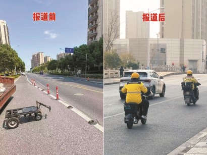 今年1月22日,记者回访在现场看到,北行路两侧100多根红白路障已不见,包括固定于道路的膨胀螺丝、底座都被彻底清除。报道时,居民曾提到,路障设置后路幅收窄,汽车掉头时无法借用非机动车道的空间,一不小心容易撞到路障。如今,来往小区机动车车库的居民均能一气呵成地掉头。打车前来的居民在临停时,也不再担心开门会撞到路障,上下车更从容。