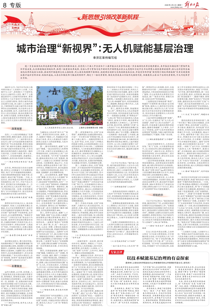 一流城市要有一流治理,要注重在科学化、精细化、智能化上下功夫。奉贤区将无人机深度融入低空经济、城市管理、民生服务三大领域,让“小飞机”发挥“大作用”,以科学化、精细化、智能化实现高效能治理。