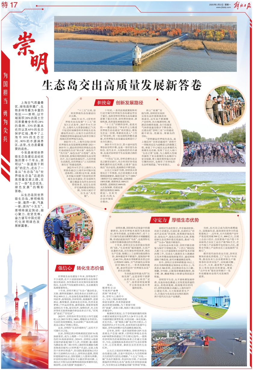 从长江之尾到世界舞台,崇明世界级生态岛建设之路,正是中国迈向人与自然和谐共生的现代化的生动缩影。“十五五”开局,一幅“生态价值彰显、农业科技引领、产业向海图强的世界级生态岛”画卷正在崇明徐徐展开,为全球生态文明建设贡献“世界级”样板。