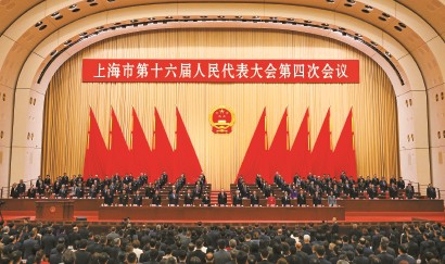 左图:昨天,上海市十六届人大四次会议在世博中心开幕。 本报记者 张驰 摄