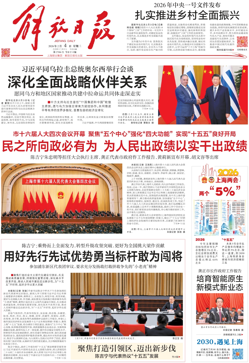 龚正说,提请本次大会审查的《上海市国民经济和社会发展第十五个五年规划纲要(草案)》,提出了“十五五”时期上海经济社会发展的主要目标和任务,还展望了到2035年的奋斗目标。 下转 10版