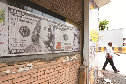 2025年4月9日,行人路过印度孟买一家外汇兑换点外的美元海报。新华社 发 -