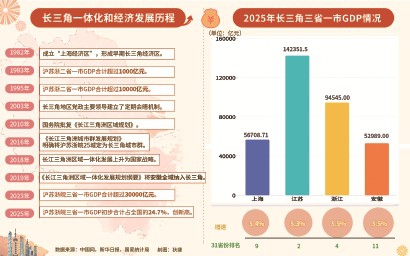 2025年,沪苏浙皖三省一市GDP初步合计达34.66万亿元,占全国比重升至约24.7%,四地增速全部高于全国平均水平,区域内“万亿城市”扩容至10座。长三角正以一体化之笔,绘就高质量发展的时代画卷。