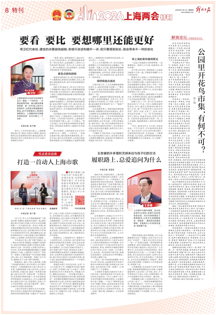 “所以,能成为市人大代表,对我来说是一个可以发声、可以做事的珍贵机会。”周卫红坦言,在自己的代表任期中,文旅热度持续走高,本身就是一个难得的机遇。也正因此,她带着深刻的情感,希望能踏踏实实为旅游业、为上海做一点事情。
