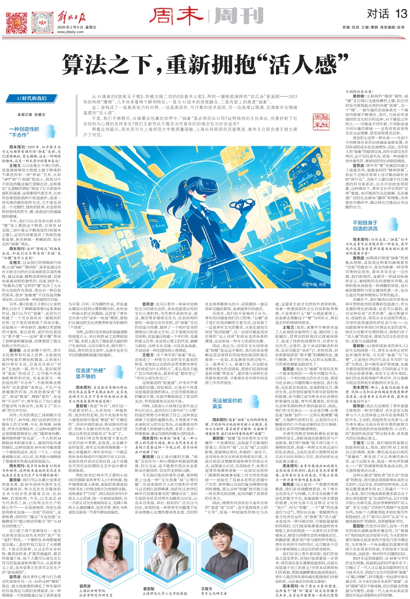 曾燕波:我从青年心理与行为模式的角度补充一点:AI的这种“赋权”效应,极大地刺激和满足了青年强烈的自我表达与即时反馈需求。当一种情绪或一个创意能通过AI工具快速变为可视、可听、可传播的作品,并迅速在圈层内获得点赞和模仿时,会形成一种强大的正向激励。这改变了青年文化参与的“成本—收益”模型,使他们从被动的文化消费者转变为积极的“产消者”。