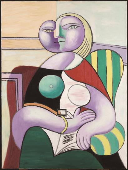《阅读》是毕加索以伴侣玛丽-特蕾兹·瓦尔特为灵感而创作的。画中女子似乎正沉浸于阅读所引发的神游之中,毕加索同时呈现了她的正脸与侧颜。身体的其余部分则由交织的线条和色块构成,仿佛与扶手椅融为一体。