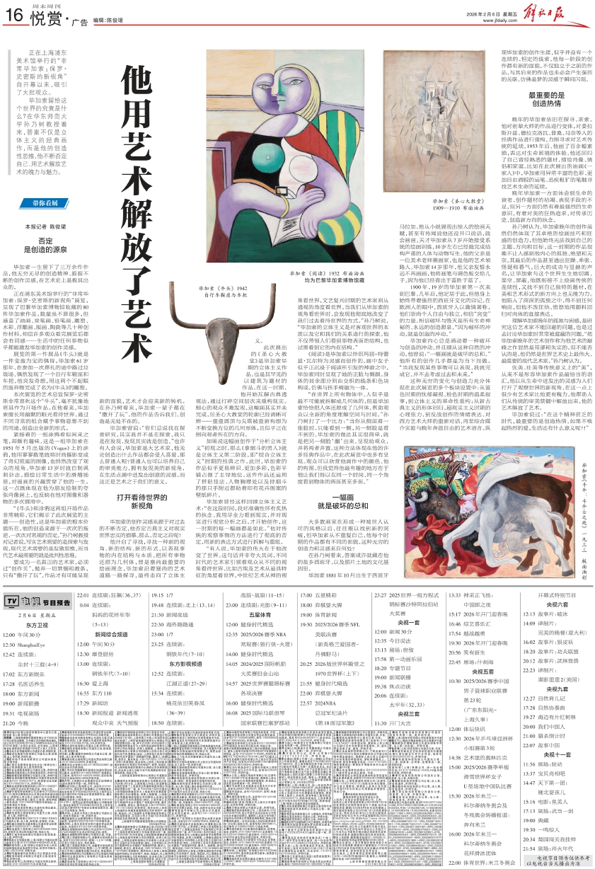 “有人说,毕加索的伟大在于他改变了世界。这句话并非夸大其词,不同时代的艺术家引领着观众从不同的视角看待世界。比如古埃及艺术从最具特征的角度看世界,中世纪艺术从神的视角看世界,文艺复兴时期的艺术家则从透视的角度看世界。当我们从毕加索的视角看世界时,会发现他彻底地改变了我们过去看待世界的方式。”孙乃树说,“毕加索的立体主义是对客观世界的本质以及它和我们的关系进行的探索。他不仅带领人们看到事物表面的结构,也试图看到它的内在结构。”