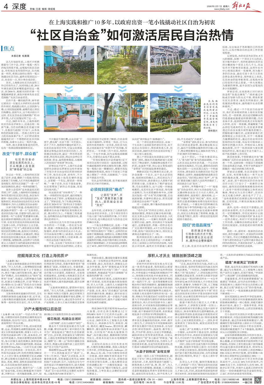 这3个项目,一个暗含着居民从“人”参与到“钱”参与的底层逻辑,一个从社区动议走向社会共建,一个让自治金体现长尾效应。可以说,都指向自治的根本目的——让社区真正成为一个利益共同体。浦东新区长岛路居民区书记李秀勤说,这两年,她最爱做的就是推动自治金项目。“我们把让居民‘发声’,并‘发动’愿意贡献力量的人这前两步做好了,居民就会主动‘发光’。”