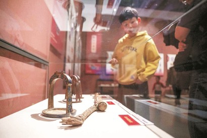 2月7日,在内蒙古博物院,小观众参观“马舞新春——丙午马年全球生肖文化联展”上展出的现代马鞭与近现代龙首铁马镫。