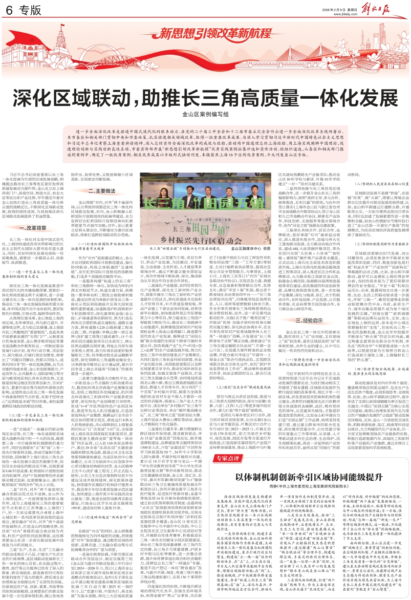 进一步全面深化改革是推进中国式现代化的根本动力。在党的二十届三中全会和十二届市委五次全会作出进一步全面深化改革系统部署后,本市各区和相关部门贯彻中央和市委决策,扎实推进相关领域改革,取得一批重要改革成果。为深入学习贯彻习近平新时代中国特色社会主义思想和习近平总书记考察上海重要讲话精神,深入总结宣传全面深化改革的成效与经验,推动用中国道理总结上海经验、用上海实践阐释中国理论,促进理论创新与实践创新良性互动,市委宣传部开展“新思想引领改革新航程”优秀实践案例征集评选和宣传活动。经组织遴选,从各区和相关部门报送的案例中,确定了一批优秀案例。相关优秀成果以专版形式陆续刊发。本报聚焦上海16个区的优秀案例,今天刊发金山区专版。