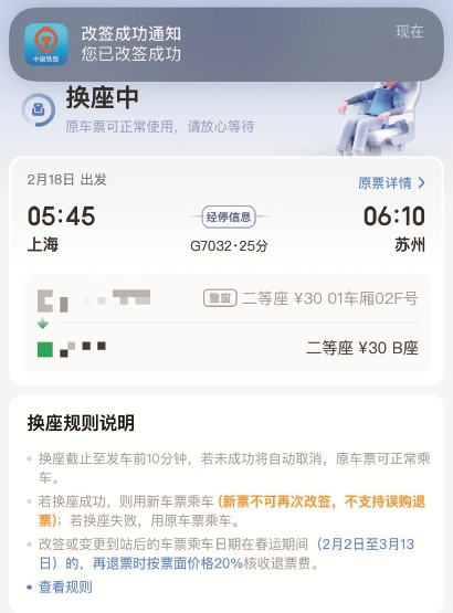 换座成功的同时12306提示“改签成功”。 -
