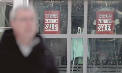 2月8日,在格陵兰岛首府努克,商铺橱窗上贴着“格陵兰岛不出售”标语。新华社发