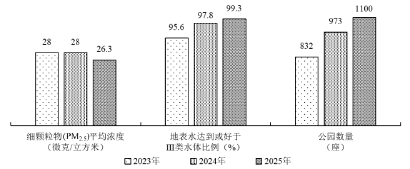 生态文明建设持续加强。深入实施美丽上海建设三年行动计划,加快国四柴油车、国二非道路移动机械淘汰更新,全市环境空气质量指数(AQI)优良率为88.5%,细颗粒物(PM2.5)平均浓度为26.3微克/立方米、比上年下降7.4%(见图3)。持续推进雨污混接和入河入海排污口整治,推进雨水污水“厂站网”一体化运维管理,地表水达到或好于Ⅲ类水体比例为99.3%。开展土壤污染源头防控行动,深入推动全域土地综合整治,有序启动首批“沪派江南”特色村落风貌保护传承试点工作。实施碳市场全面深化改革行动方案,全国碳市场碳排放配额全年成交146.3亿元,举办2025年上海国际碳中和博览会,新增光伏装机214万千瓦,金山海上风电一期建成投运,完善绿电供应体系。推进全域“无废城市”建设,全面启动固体废物综合治理和近零填埋,深化单位生活垃圾收费改革。“千园之城”提前建成,新增各类公园127座、累计1100座,983座公园实现24小时开放,新建绿地1014.4公顷、绿道137公里、立体绿化42.5万平方米,崇明获得国际湿地城市认证。