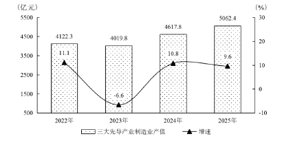 现代化产业体系持续构建。深入实施新一轮三大先导产业“上海方案”(见图1)。集成电路全产业链布局扎实推进,关键设备和材料攻关取得重大进展。实施“人工智能+”行动和“模塑申城”工程,成功举办2025世界人工智能大会,推动国家人工智能产业投资基金落地,打造人工智能产业生态,累计138款大模型通过备案。制定实施促进高端医疗器械产业全链条发展行动方案,9个国产1类创新药、9个三类创新医疗器械获批上市。完善智能终端、智算云、具身智能、商业航天等产业发展政策,制定实施脑机接口、量子计算、硅光、6G等领域未来产业培育方案,启动建设4个未来产业集聚区。高质量打造14个区级主导产业特色赛道集聚区。加快推动产业智能化、绿色化、融合化发展,新增2家国家领航级智能工厂、16家卓越级智能工厂,全年工业增加值比上年增长5%。深入推进工业降本增效,盘活处置低效产业用地30.4平方公里。促进服务业高质量发展,实施新一轮服务业扩大开放综合试点,金融、信息服务、文化创意、航运服务等现代服务业能级加快提升,美丽健康、家政服务、银发经济等领域服务供给品质不断提高,全年第三产业增加值比上年增长6%,其中金融业、软件和信息服务业增加值分别增长9.7%、15.3%。