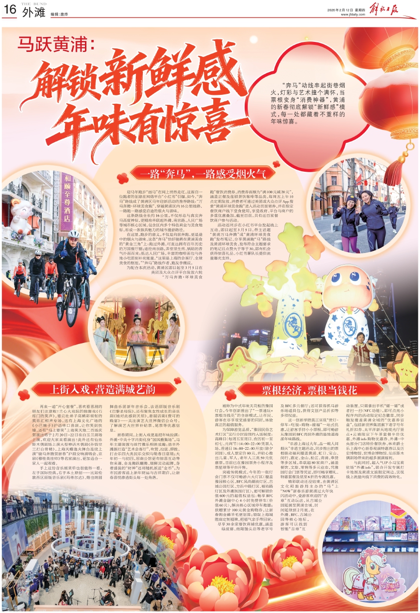 精彩联动还没结束。由黄浦区文化和旅游局主办的“马”上“NOW”新春乐游黄浦过大年快闪活动中,受游客欢迎的“吉章”互动玩法,从古城公园延展至黄浦全域,时间延续到2月底。在外滩、BFC、古城公园等核心地标,游客可以找到智能“吉章”互动装置,只需拿出手机“碰一碰”或者扫一扫(NFC功能),即可点亮小程序内的活动限定纪念徽章,同步触发覆盖黄浦全域的“优惠券盲盒”,包括新世界集团旗下老字号年礼折扣券、太平洋新天地观光厅景点+云端限定下午茶套餐半价优惠、外滩info购物优惠券、外滩·中央部分门店特价餐饮券、林肯爵士乐上海中心新春观演特惠券以及历史博物馆、世博会博物馆、仙乐斯木偶剧场带来的超多展演福利。
