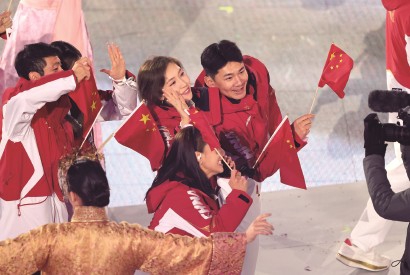 2月22日,中国体育代表团在米兰冬奥会闭幕式上入场。 新华社发