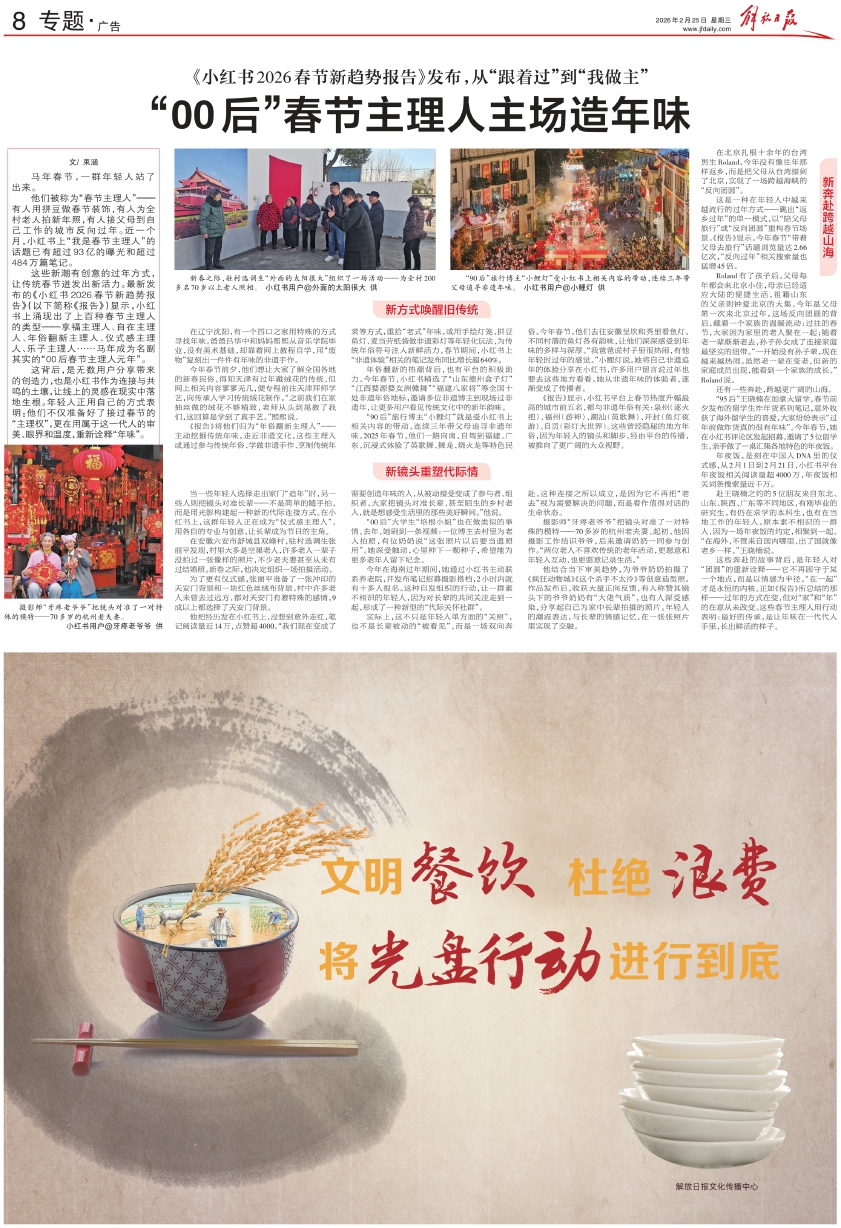 这些新潮有创意的过年方式,让传统春节迸发出新活力。最新发布的《小红书2026春节新趋势报告》(以下简称《报告》)显示,小红书上涌现出了上百种春节主理人的类型——享福主理人、自在主理人、年俗翻新主理人、仪式感主理人、乐子主理人……马年成为名副其实的“00后春节主理人元年”。