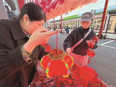 一个年轻妈妈拿起灯笼挑选。电池装上,灯笼亮了,在黑色的水泥地上映出一圈红色的光斑。光斑中间四个字围成一个圆:平安是福。
