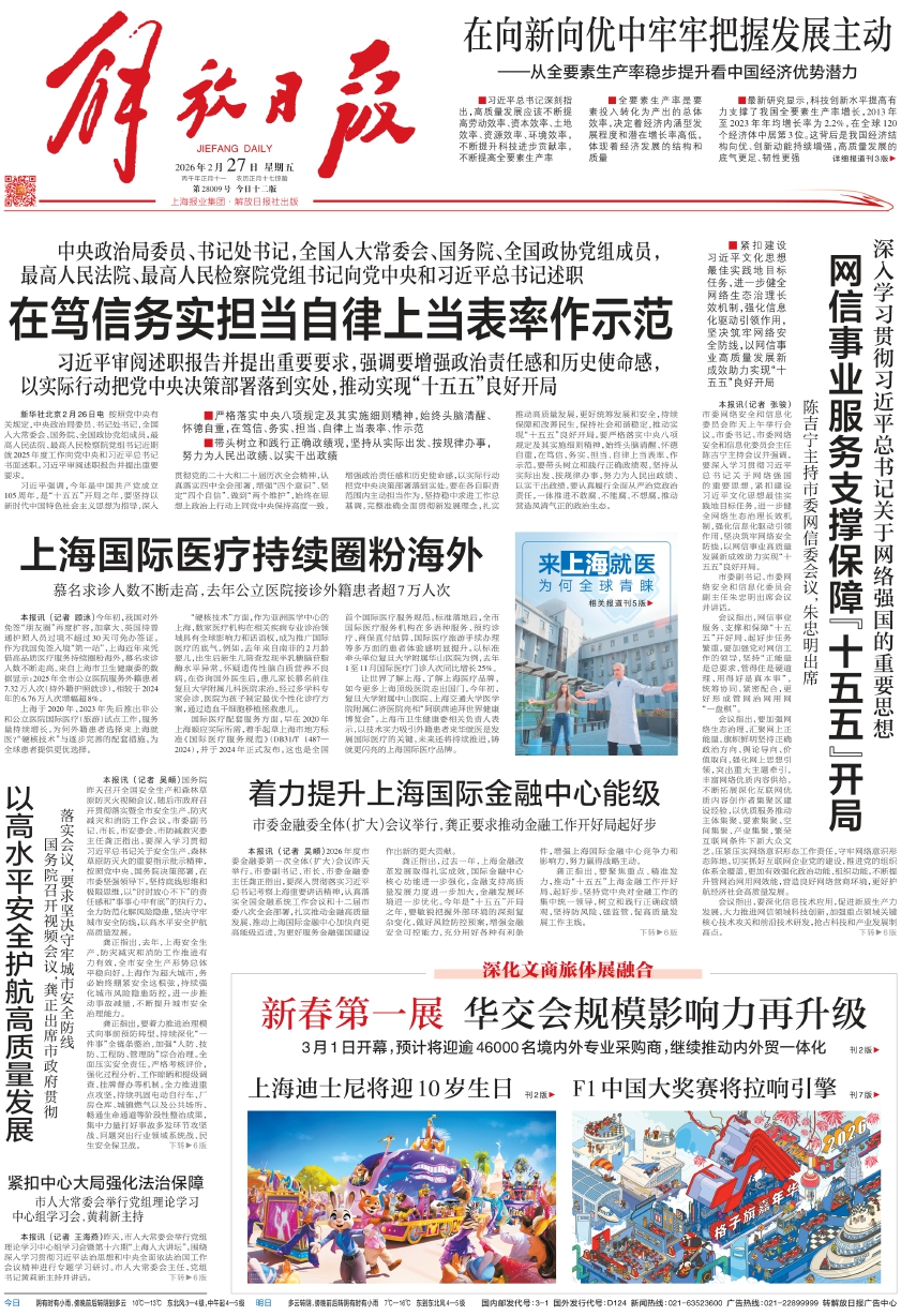黄莉新强调,要坚持党的领导、人民当家作主、依法治国有机统一,深入推进科学立法、民主立法、依法立法,增强人大监督的刚性和实效,加强法治宣传教育、弘扬法治精神,更好发挥人大在全面依法治国中的职能作用。要紧扣中心大局,勇于担当、善于作为,聚焦“五个中心”建设、高水平改革开放、人民城市建设、提高城市治理现代化水平等重大任务加强立法监督工作,积极为上海实现“十五五”良好开局强化法治保障。